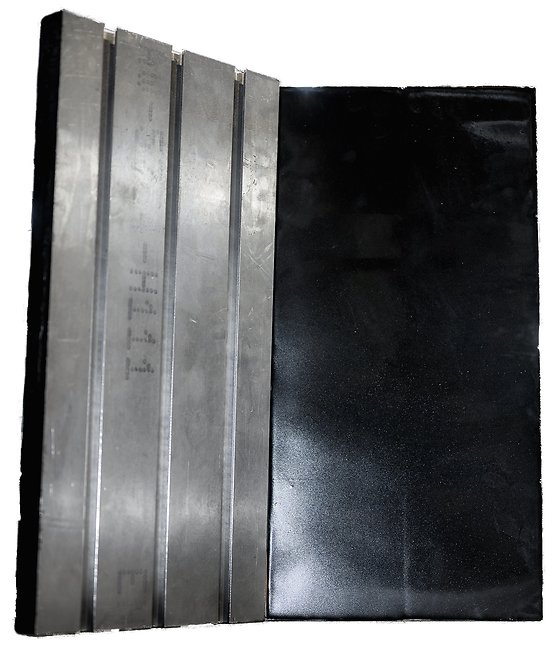 Beveled bi-metallic wear parts. Parts have tough steel backing which can be welded into structures.